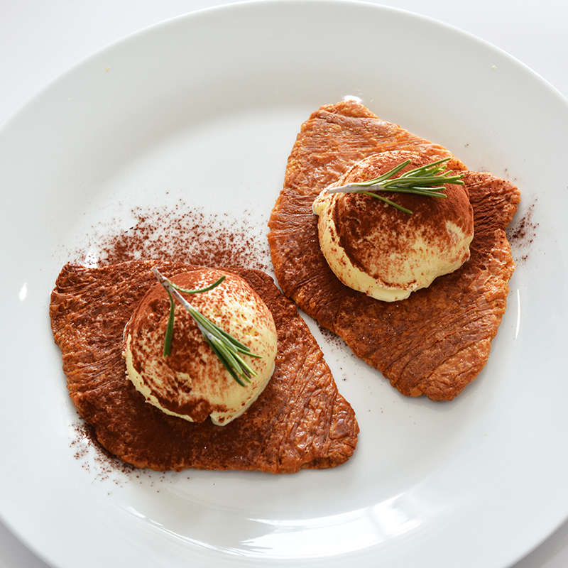 ココアパウダーとバニラアイスがのった、香り豊かなクルンジ。ローズマリーのアクセントが絶妙な一品です。
