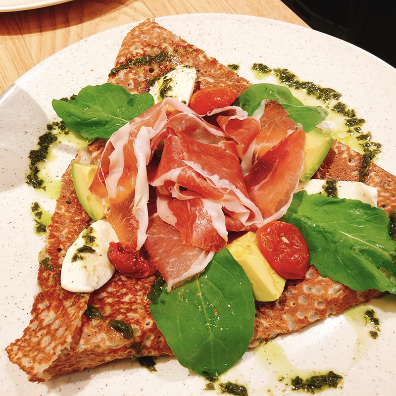 モッツァレラチーズと生ハム、バジル、トマトが絶妙に組み合わさったガレット。シンプルながら豊かな味わいが楽しめます。