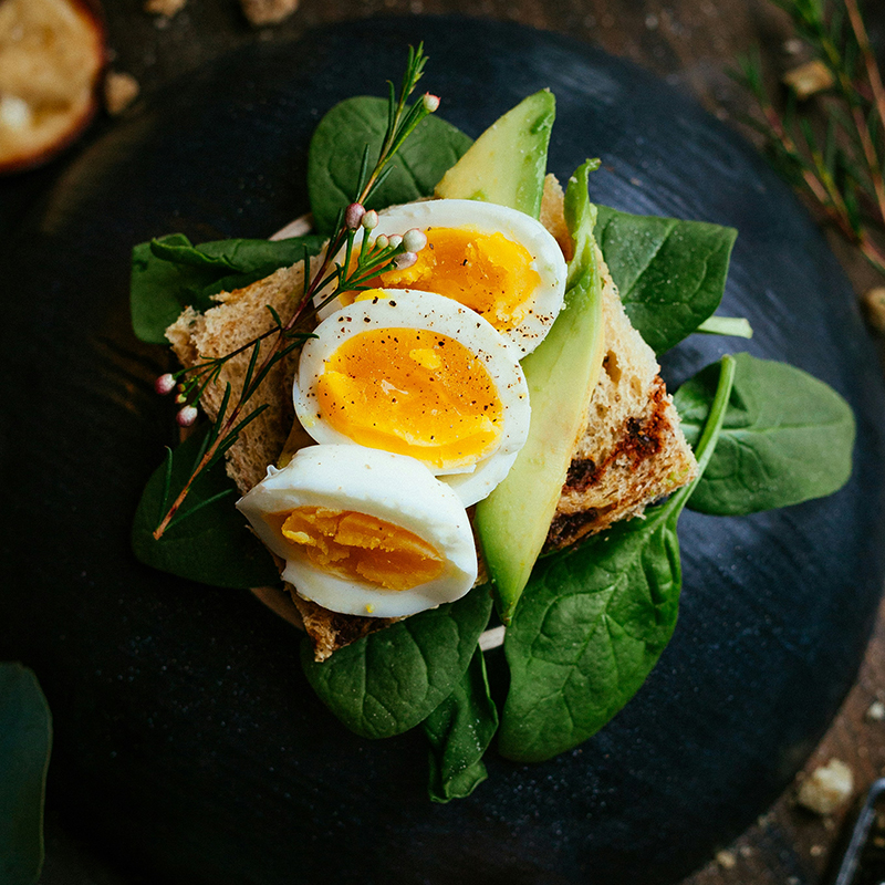 カリカリのトーストに、ほうれん草、アボカド、ゆでたまごをのせたヘルシーなオープンサンド。栄養満点で、朝食にもぴったりです。