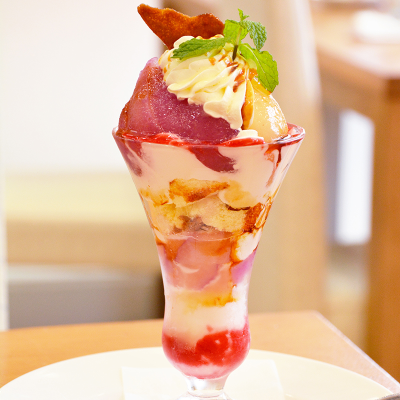 甘くてジューシーな洋ナシがたっぷりのったパフェ。クリーミーな仕上がりで、フルーツの美味しさを引き立てます。