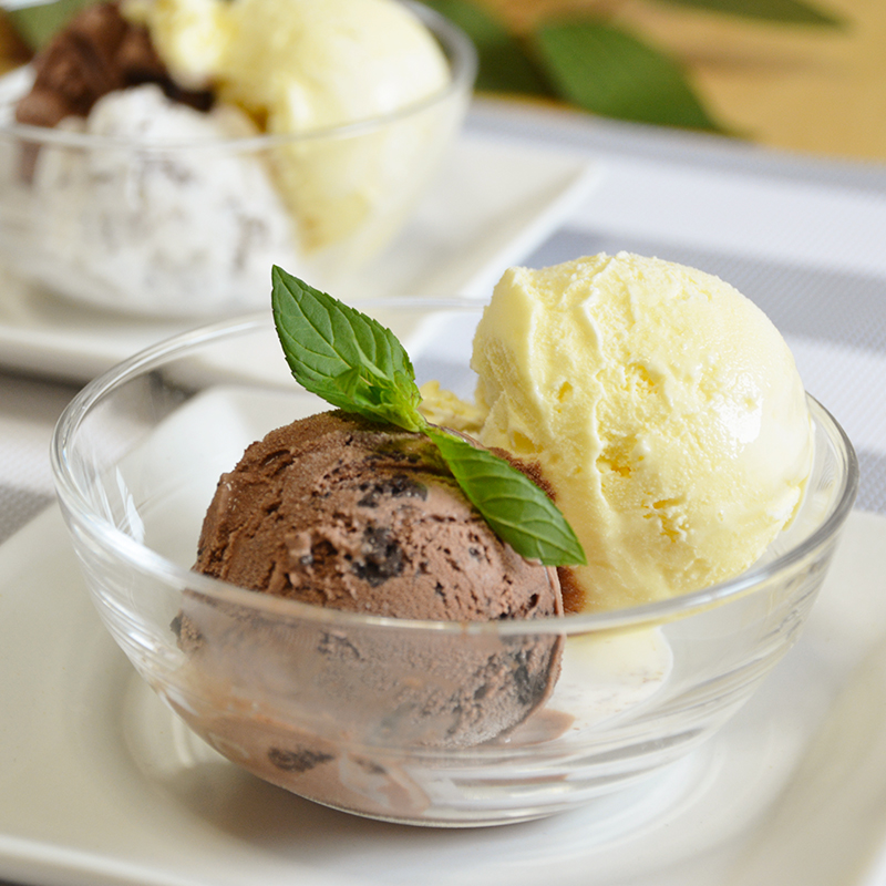 チョコチップ入りチョコアイスとバニラアイスをひと盛りに。ミントの葉が香りを引き立て、見た目も美しい一品です。